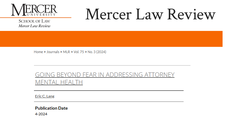 State Bar of Georgia. As a result of State Bar of Georgia General Counsel Paula Frederick identifying Eric Lang’s research as being unique in the area of attorney mental health and the discipline process, Eric was invited as a guest on the Bar’s Lawyers Living Well podcast. You can hear about that subject and others by checking out the podcast itself.